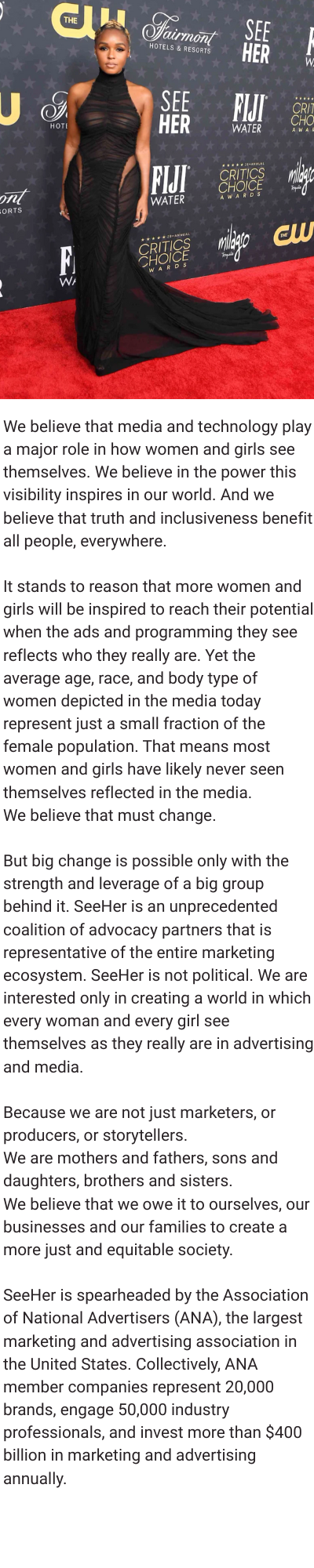 with an anthem video and a flurry of publicity from the likes of Oprah and the Obamas. The mission: to accurately portray women and girls across all media so that by 2020, they see themselves reflected as they truly are. With the mantra of "if you can see her, you can be her," the effort was rapidly embraced by the world’s largest movie studios and advertisers and countless media producers across all platforms.